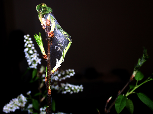 veistosinstallaatioita ja ääni 5.30 min., loop. Teoksessa olevat oksat versoivat ja kukkivat näyttelyn edetessä tammikuun pakkaspäivinä.